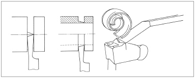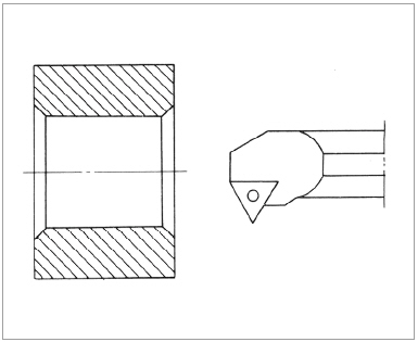 3) 관통 구멍의 양단면 모떼기 가공 : <그림12>와 같은 공구를 쓰면 관통 구멍의 보링 가공을 하면서 양단의 모떼기 가공을 하는 데 효과적이다. 또 이 공구는 노즈 반지름이 작은 팁을 붙이면 60° 산형의 내경 나사 절삭을 할 수 있다.