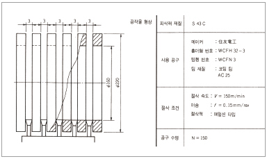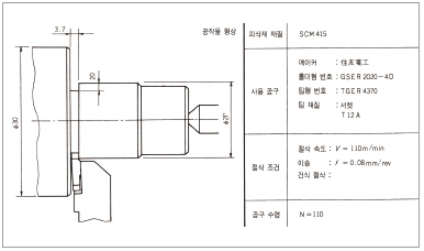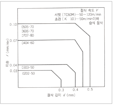 공구 재종으로는 강인 서멧(TC60M), 초경 K10이 준비되어 있다. 권장 절삭 조건은 <그림7>과 같다. 팁 재종의 사용 분류는 일반강 및 스테인리스강의 가공에서 절삭 속도가 V = 50m/min 이상일 때는 서멧(TC60M)을, V = 50m/min 이하일 때나 비철금속의 절삭에는 초경 K10을 사용한다.