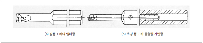 <그림6>의 (a)는 강섕크 바의 일체형, (b)가 초경 섕크 바의 돌출 가변형이다. 팁은 소내경의 보링 가공에 대응하기 위하여 삼각형 팁의 변을 일부 컷한 변형 육각형을 쓰고, 날 끝 각도는 강도 향상을 지향한 80° 규격으로 되어 있다.