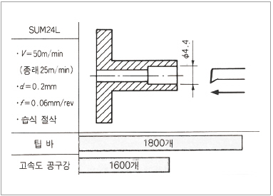 기존에는 고속도 공구강 바이트를 수동 연삭하여 사용하고 있었다. 팁 바는 절삭 속도를 2배로 올려서 가공 시간이 짧아진 것 외에 고속도 공구강 바이트의 수동 연마에서는 수명의 편차가 컸었는데 반해, 추가 가공이 필요 없는 안정 상태에서 1,800개/코너의 수명이 되고 있다.