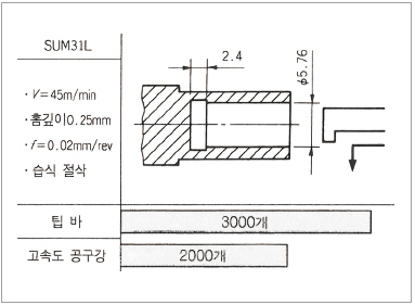 <그림9>는 홈절삭 팁 바에 의한 내경 ø5.76㎜의 구멍에 폭 2.4㎜인 홈절삭 가공의 예로 피삭재는 유황 쾌삭강 SIM31L이다. 이 가공에서도 기존에는 고속도 공구가 바이트를 수동 연마한 다음 추가 연삭하여 사용하고 있었다. 수동 연마 바이트를 만드는 데는 30분이 필요하고 경험도 요구되는 작업이다. 누구나 할 수 있는 일은 아니다. 이 문제도 홈절삭 팁 바를 사용하면 해결할 수 있고 공구 수명도 고속도 공구강에 비해 50%나 향상시킬 수 있다.