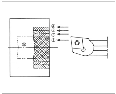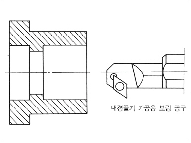 1) 동심도내기 가공 : <그림10>과 같은 외경과 내경의 동심도가 필요한 공작물이라면 원 처킹으로 외경, 내경을 선삭해야 한다. 이 때 내경부 깊은 곳의 가공이 문제가 되는데, 내경끌기 가공용 보링 공구를 써 이를 해결한다.