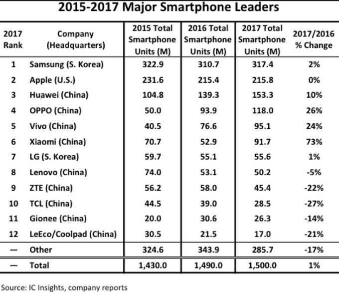 시장조사기간인 IC Insights에 따르면, 2017년 글로벌 스마트폰 시장에서 판매량 상위 12개 사 중 9개 사가 중국 기업인 것으로 조사됐다. 나머지 3개 사는 삼성전자와 애플, LG전자다.
