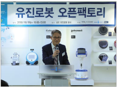 이어 유진로봇 신경철 회장은 인사말을 통해 “올해 유진로봇이 30주년을 맞이했다. IMF전까지 산업용로봇 사업을 하다가 IMF 이후 서비스 로봇의 전환, 그리고 IMF 시기를 견디고 성장의 단계를 밟아오면서 작년 연매출 약 650억 원을 올렸으며, 현재 약 150여명의 임직원이 근무하고 있다”며 “앞으로도 R&D 역량 강화는 물론, 고객이 만족하는 최고의 품질 지향, 로봇 서비스융합을 통한 혁신 가치를 창출할 수 있는 지능형 서비스 로봇 기업으로 성장해나가겠다”고 말했다.