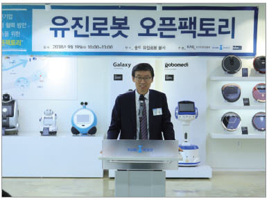 신경철 회장은 인사말에 이어 유진로봇의 소개와 함께 사업화 전략에 대해 설명했다. 4차 산업혁명 로봇시대가 성큼 다가오는 이때 유진로봇이 올해 800억 매출을 내다보고, 앞으로 더욱 성장가능성이 높은 이유는 기술력이 뒷받침하기 때문이다.