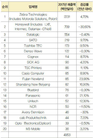 ▲ 2017년도 글로벌 AIDC 공급업체 매출액 순위