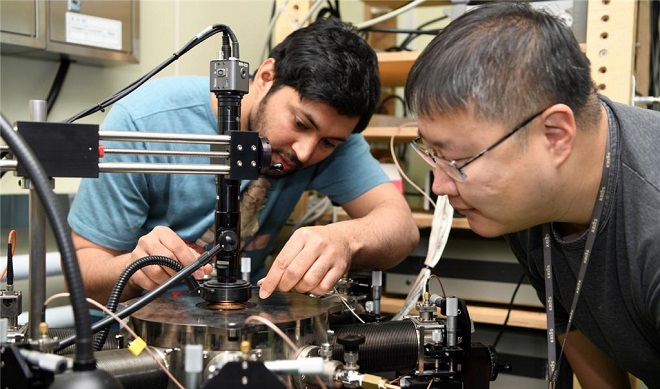 ▲ KRISS 연구팀이 수직형 다이오드 전자수송 특성 측정을 위해 준비하고 있다.