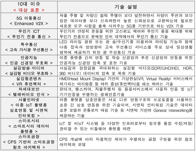 이번에 선정된 10대 이슈는 4차산업혁명 실현을 위한 핵심동력인 D.N.A(Data, Network, AI) 표준분야, 사물인터넷, 차세대보안 등 ICT 핵심기술 표준분야, 스마트시티, 스마트공장, 실감방송/미디어, 실감형콘텐츠 등 ICT 융합서비스 표준분야가 포함돼 있다.