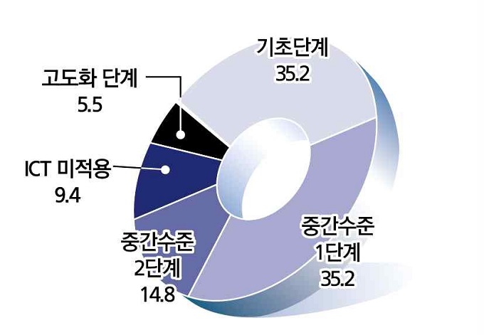 기업이 판단하는 스마트공장 도입 수준은 ‘기초단계’와 ‘중간 1단계’가 각각 35.2%로 가장 높게 나타났다. 다음으로 중간수준 2단계(14.8%) > ICT 미적용(9.4%) > 고도화 단계(5.5%) 순이었다. 이는 정부에서 파악하는 스마트공장 도입 수준과 차이가 있는 응답으로, 보고서는 중소벤처기업이 스마트공장 수준에 대한 개념적 이해가 다소 부족한 것에 기인한 것으로 분석했다.