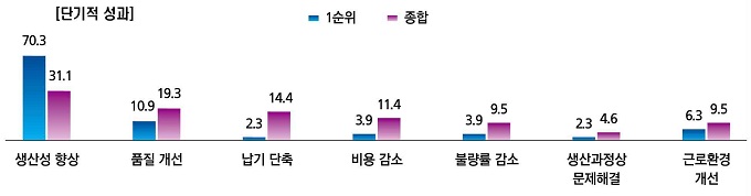 제조현장 스마트화를 위한 시설도입 이후 기대하는 단기적 성과로 생산성 향상(1순위 70.3%, 종합순위 31.1%)이 가장 높게 나타났으며, 이어 품질개선(종합순위 기준, 19.3%) > 납기단축(14.4%) > 비용감소(11.4%) > 불량률 감소(9.5%) 순으로 단기성과를 기대하는 것으로 조사됐다.