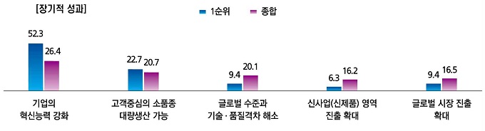 장기적인 기대성과로는 ‘기업의 혁신능력 강화(1순위 52.3%, 종합 26.4%)’가 가장 높았으며, 고객중심의 소품종 대량생산 가능(종합순위 기준, 20.7%) > 글로벌 수준과 기술·품질 격차 해소(20.1%) > 신사업 영역 진출확대(16.2%) 순으로 장기적인 성과를 기대했다.