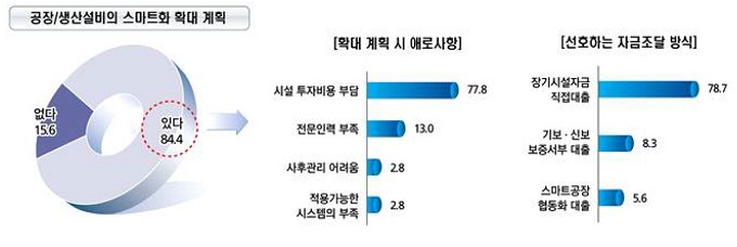 스마트공장 또는 제조현장의 스마트화 확대계획에 대해서는 응답자의 84.4%가 '계획이 있다'라고 응답했다. 계획이 있는 기업을 대상으로 확대 시 애로사항을 조한 결과 ‘시설 투자비용 부담’이 77.8%로 가장 높았다. 그리고 시설 투자비용 부담 외에, 전문인력 부족(13.0%) > 사후관리 어려움(2.8%) > 적용 가능한 시스템 부족(2.8%) 순으로 애로사항을 꼽았다.