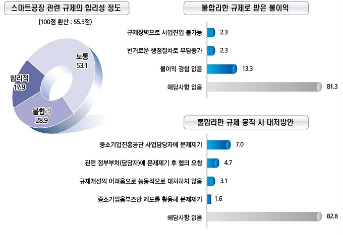 이러한 응답은 스마트공장 규제와 관련하여 실질적인 불이익을 받지 않았거나 직접적인 규제를 인지하지 못하였으나, 규제에 대한 일반적인 부정적 인식으로 규제가 ‘불합리하다’ 라는 의견이 다소 높게 나온 것으로 보고서는 분석했다.