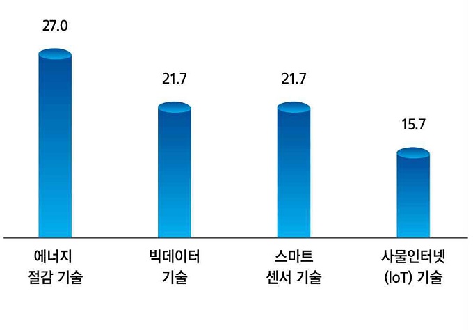 스마트공장 8대 핵심 기술(공급 기술) 중 규제개선이 가장 시급한 분야에 대해서는 에너지절감 기술(27.0%)이 가장 높았다. 다음으로 빅데이터 기술(21.7%) > 스마트 센서 기술(21.7%) > 사물인터넷(IoT)기술(15.7%) > 클라우드 기술(6.1%) 순으로 나타났다.
