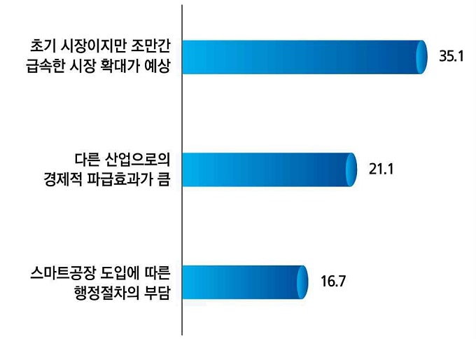해당분야의 규제개선이 필요한 사유에 대해서는 ‘초기 시장이지만 급속한 시장확대가 예상’이 35.1%로 가장 많았다. 그리고 다른 산업으로 경제적 파급 효가 큼(21.1%) > 스마트 공장 도입에 따른 행정절차 부담(16.7%) > 규제자체가 존재하지 않아 제품 개발과 유통이 불가(13.2%) 순으로 조사됐다.