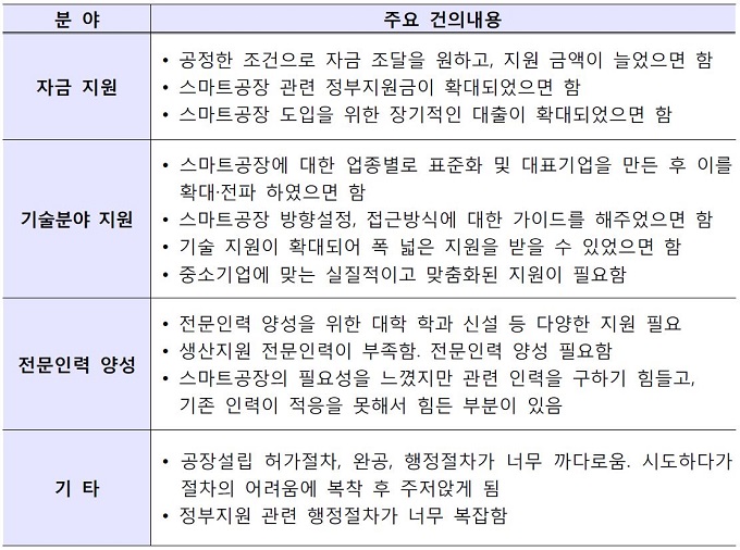 이밖에도 스마트공장 관련하여 정부지원 활성화 및 규제에 대해 ‘자금지원 확대’ 요청이 가장 많았으며, 이외에 기술 분야의 폭 넓은 정부지원 확대, 스마트공장 전문인력 양성 지원강화에 대한 응답도 나왔다.