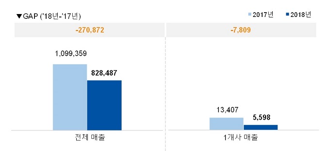 회원사 매출 규모는 작년(9630억원) 대비 57.9% 감소한 반면, 비회원사는 작년(9630억원)보다 210.3% 성장한 것으로 나타났다.