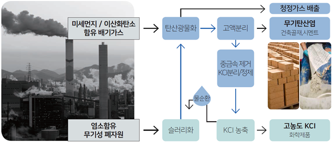연구진은 연구를 거듭한 끝에 시멘트 제조 시 배출되는 폐기물인 염화칼륨(KCl) 함유 먼지 및 이산화탄소를 유용한 탄산칼슘으로 전환하는 친환경적이며 경제적인 기술을 개발했다.
