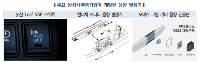 닛산, GM 등 완성차기업들은 이미 가상 음향 발생기를 개발해 장착하고 있으며, 산학연을 중심으로 관련 기술이 활발하게 연구되는 추세다. 국내에서도 현대차를 포함한 산학연이 전기차 음향 발생 기술 분야에서 특허를 출원하고 있다.