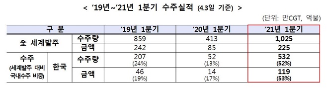 산업통상자원부는 우리나라 조선산업이 전 세계 발주량 1025만CGT 중 532만CGT(119억불)을 수주해 ‘21년 1분기에 전세계 1위 수주량을 달성했다고 밝혔다.