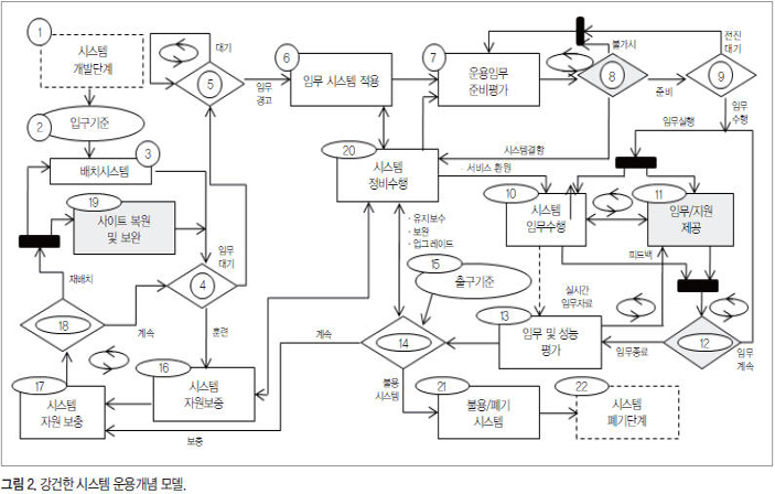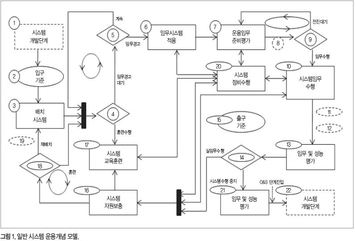 그림 1은 대부분의 인공 시스템에 적용되는 시스템 운용 모델을 나타내고 있다. 모델 진입은 시스템/제품 수명주기의 시스템 개발단계(1)로부터 전환될 때 시작한다. 입구기준(2)은 실 임무를 시작하기 위해 시스템 준비 상태를 점검한다. 다음 진행단계를 세부적으로 살펴보자.