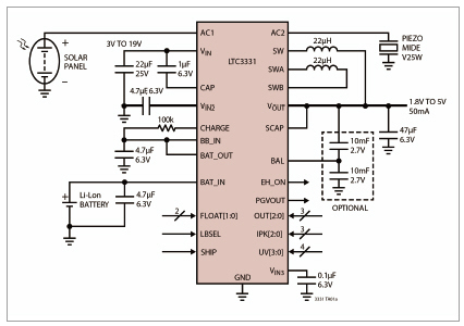 LTC3331의 에너지 하베스팅 전원은 AC 또는 DC 입력을 수용할 수 있는 전파(Full-wave) 브리지 정류기와 고효율 동기식 벅 컨버터로 이루어졌으며 압전(AC), 태양광(DC), 자기(AC) 소스로부터 에너지를 하베스팅할 수 있다. 10mA 션트로 하베스팅된 에너지를 이용해 배터리를 간편하게 충전할 수 있으며 ‘Low-battery’ 차단 기능은 배터리가 극심하게 방전되는 것을 방지한다. 재충전 가능한 배터리를 이용하여 입력에서 1.8V∼5.5V로 동작하는 동기식 벅-부스트 컨버터를 구동시킨다. 그러므로 하베스팅 에너지를 사용할 수 없게 되었을 때 이를 이용하면 입력이 출력보다 높든, 낮든, 동일하든 상관 없이 출력을 레귤레이트할 수 있다.