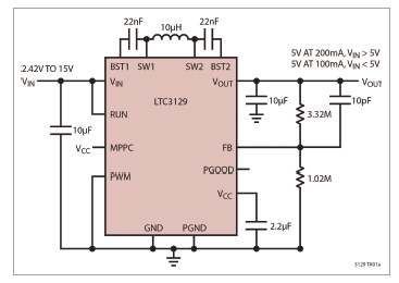LTC3129는 여러 가지 입력 소스로부터 최대 200mA의 연속 출력 전류를 제공할 수 있는 동기식 벅-부스트 컨버터이다. 이러한 입력 소스로는 단일 또는 다중 셀 배터리에 태양광 패널과 슈퍼 커패시터 입력을 포함한다. 2.42V∼15V 입력 범위와 1.4V∼15.75V의 출력 범위는 출력보다 높거나, 낮거나, 동일한 입력을 이용해 레귤레이트 출력을 제공할 수 있다. LTC3129는 또한 저잡음 벅-부스트 토폴로지를 채택함으로써 모든 동작 모드로 매끄럽게 동작할 수 있기 때문에, 입력 소스 전압이 출력보다 낮게 떨어지더라도 일정한 출력 전압을 유지해야 하는 에너지 하베스팅 애플리케이션에 이상적이다(그림 2).