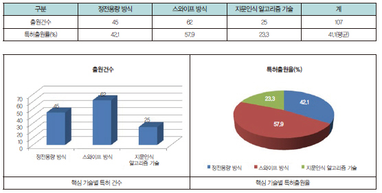 •지문인식 기술을 모바일기기에 적용하는 데 있어 중요한 성능을 발휘할 수 있는 132건의 핵심특허 세부내용은 정전용량 방식 45건, 스와이프 방식 62건, 지문인식 알고리즘 기술 25건으로 나타났다.