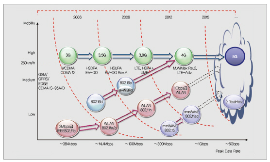 최근에는 LTE보다 1,000배 빠른 데이터 전송 속도를 목표로 한, 5세대 이동통신 서비스의 표준화 및 기술 개발이 추진되고 있다.