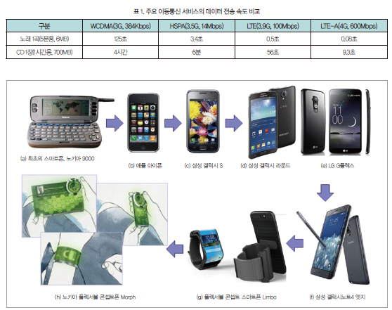 초고속 데이터 송수신 및 초고주파수화 등 이동통신이 발달하면서 스마트폰 기술도 빠르게 발전했다. 최초의 스마트폰인 노키아의 ‘9000’은 피처폰과 유사한 기능 및 형상이었으며 풀 컬러 터치스크린, 애플리케이션 프로그램 등의 등장을 촉발한 애플의 ‘아이폰’은 스마트폰의 대중화와 함께 형상의 변신을 이루었고, 이후 국내 업체들의 재도약 및 약진과 함께 플렉서블 스마트폰이 출시되기에 이르렀다.
