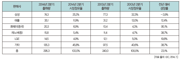 표 2. 2013년 2분기, 2014년의 업체별 전 세계 스마트폰 출하량 및 점유율 비교 (단위 : 백만대)