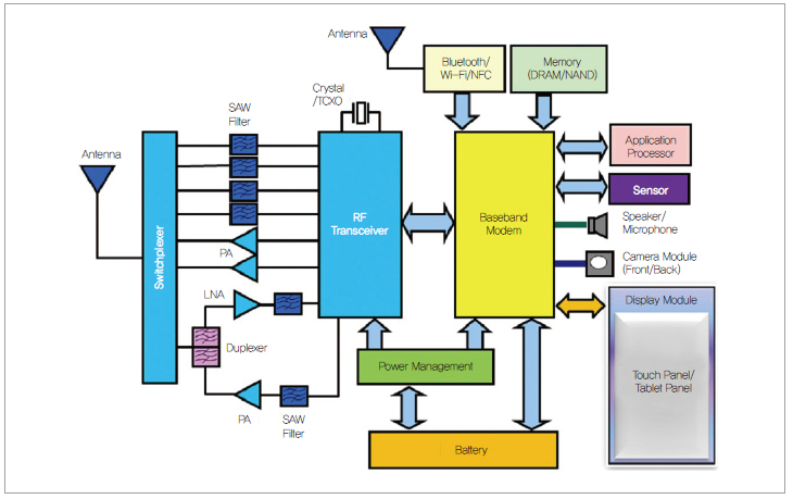 그림 4는 스마트폰의 내부 블록도를 나타낸 것으로, 앞에서 설명한 바와 같이 음성 및 멀티미디어 데이터를 송수신하는 RF 부품과 다양한 센서 부품들은 대부분 수입에 의존하고 있다.