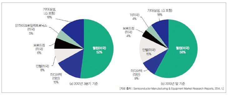세부적으로 각 부품의 기술 및 시장 동향을 살펴보면, 먼저 베이스밴드 모뎀의 경우 2012년 3분기에 미국의 퀄컴이 전체 시장의 52%를 차지했고, 대만의 미디어텍이 대만 및 중국의 중저가 휴대폰 시장 공략으로 2위를 차지했으나, 2013년말에는 퀄컴의 시장 점유율이 58%로 증가했고, 인텔이 2위, 미디어텍이 3위를 차지했다. 퀄컴의 점유율 증가는 AP를 통합한 모뎀 칩셋에 기인한 것이며, 스마트폰의 증가로 피처폰 시장이 감소함에 따라 피처폰 중심으로 시장을 점유했던 미디어텍의 점유율은 감소했다.