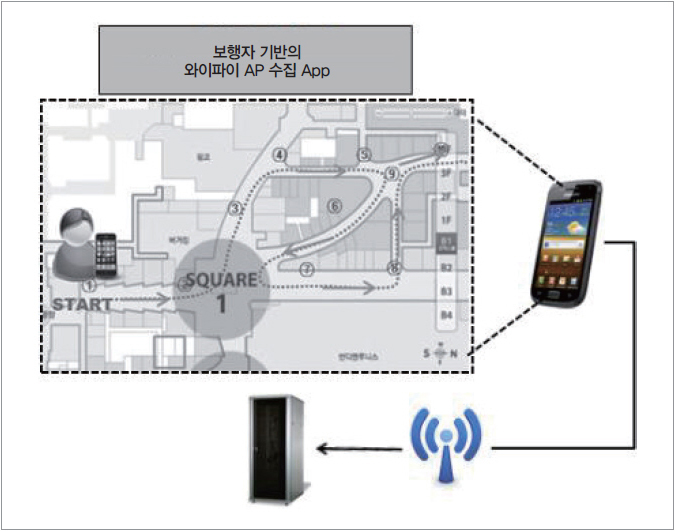 그림 2는 보행자용 인프라 측정 정보 자동 수집 기술의 개념도이다. 이 기술은 스마트폰을 이용하여 실내지도 상에 수집 경로를 설정하고, 수집을 시작하면 자동으로 수집 위치 및 주변 인프라 측정 정보를 획득한다. 수집 위치는 경로 정보와 보행자 추측항법(Pedestrian Dead Reckoning) 기술을 결합하여 계산하며, 시간이 경과됨에 따라 누적되는 수집 위치 오차는 경로변화 시 센서 이벤트 정보를 인식하여 맵매칭을 통해 제거함으로써, 장시간 동적 수집 시 고정밀도의 수집 위치 정확도를 제공한다.