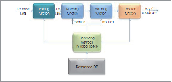 실내 공간 지오코딩 기법의 흐름은 그림 4와 같이, 기존의 지오코딩 기법을 응용 및 개선하는 방향으로 연구되고 있다. 실내에서 특정 공간에 대해 서술하는 기술 데이터(Descriptive Data)를 자동 취득하기 위해, 이를 인식할 수 있는 인지(Recognition) 기능이 구성된다. 기술 데이터는 인식을 거쳐 가공 가능한 텍스트 데이터로 변환되며, 실내 지오코딩을 위해 개선된 파싱 및 매칭 기능을 거쳐 (x,y,z) 위치 좌표를 추출하게 된다.