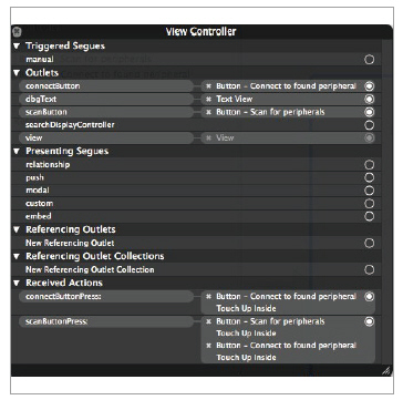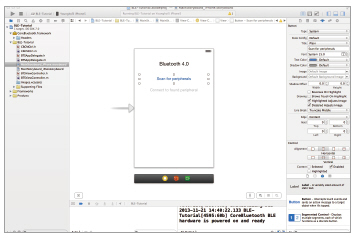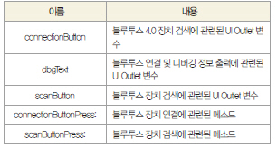 이번 예제에서 사용하는 내용은 그림 6과 같다. 프로그램의 설명을 하기 위한 UILabel, 블루투스 4.0 장치를 찾기 위한 버튼 및 찾은 장치와 연결하기 위한 버튼, 두 버튼 모두 UIButton으로 구성한다. 그리고 마지막으로 UITextView를 활용하여 블루투스 장치에 관한 작업을 할때 발생하는 세부 정보를 출력하도록 구성한다.