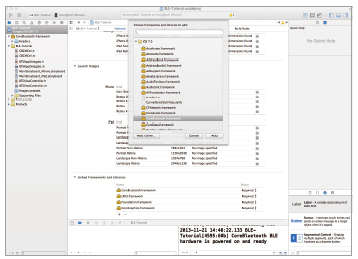그림 4는 블루투스 4.0을 이용한 테스트 프로젝트의 그림이다. 프로젝트를 시작할때 중요한 내용은 CoreBluetooth(그림 5 참조)프레임웍을 포함시키는 것이다. 해당 프레임웍은 블루투스 통신을 위한 대부분의 API가 포함되어 있다.
