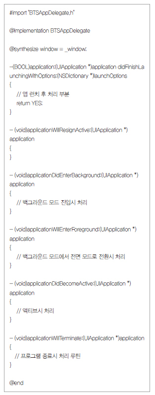 BTSAppDelegate.m 및 BTSAppDelegate.h 파일은 블루투스 테스트 프로젝트 자동 생성된 파일이며 앱의 기본 동작을 담당한다. BTSViewController.h 는 뷰 콘트롤러 소스로 실제 UI 버튼 및 연결 정보를 처리하는데 사용한다. CBCMCtrl.h및CBCMCtrl.m 파일은 블루투스 연결 관리 클래스로써 coreBluetooth 프레임웍에서 블루투스 연결 관리를 위해 사용하는 centralManager에 대한 동작 및 상태 정보를 관리하는 클래스로 구성되었다.