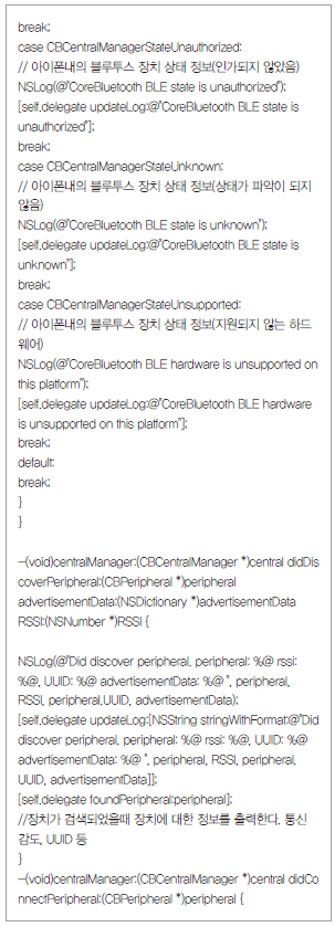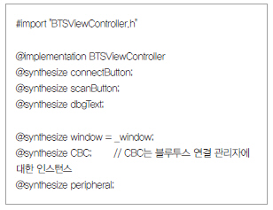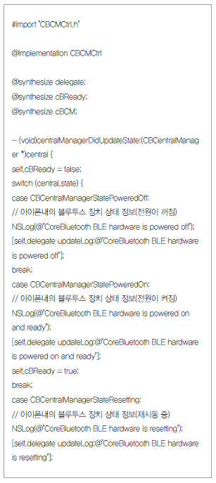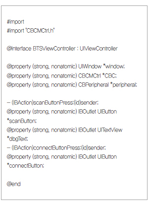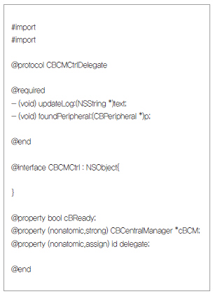 CBCMCtrl.h 파일은 블루트스 연결 관리에 대한 클래스 정의 파일이다. 블루투스 연결에 사용되는 주요 클래스는CBCentralManager 클래스로써 블루투스의 연결 및 장치, 상태 정보를 관리하기 위한 메소드를 가지고 있다.