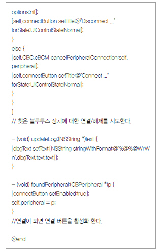 지금까지 아이폰과 블루투스 장치간의 연결에 대해 대략적인 내용을 살펴봤다. 블루투스와의 연결 및 처리는 소스에서 볼 수 있듯이 꽤 간단하게 처리할 수 있다. 핵심적인 내용이 프레임웍 내부에 구성되어 있기 때문이다. 이러한 부분은 내용이 매우 많기 때문에 다음 연재에서 설명하고자 한다.