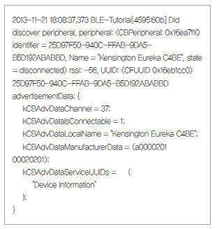 위 로그는 검색된 장치에 대한 세부 정보이다. 여기서 특이하게 봐야하는 것은 UUID다. UUID는Uinique User Identidfier의 약자로써 고유 번호를 의미한다. 블루투스 4.0에서는 이 UUID가 자주 등장하며 장치간의 연결 및 프로파일에 관련된 정보에서도 중요하게 사용된다. 불루투스 장치의 무선 감도를 나타내는 RSSI 정보, 장치의 고유 이름 등의 정보를 이용하여 어떠한 장치인지, 어떠한 기능을 사용할 수 있는지 정보를 아이폰에 전달해 주게 된다.