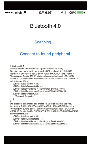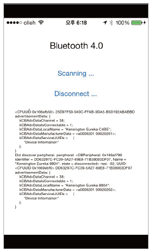 그림 9는 블루투스 장치가 아이폰에 연결된 후 출력되는 로그 및 화면이다. 현재 아이폰과는 미국 켄싱톤의 블루투스 장치가 연결되어 있으며 연결후에는 연결 정보를 통해 장치에 대한 상태 및 세부 동작을 제어하게 된다. 실제로 블루투스 장치와의 작업은 연결, 필요한 프로파일에 대한 설정, 전달된 정보 처리등을 통해 아이폰과 통신 작업이 이루어지게 된다.