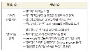 이미지 파일 카빙 기술을 구현하기 위해서는 데이터 파일 카빙 기법과 이를 토대로 한 알고리즘 설계기법 등 다음과 같은 세부적인 기술개발이 필요하다. 이미지 파일 카빙 기술트리를 표 1에 나타낸다.