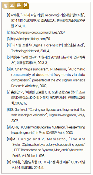 아울러 디지털 데이터를 분석하여 법적 요건에 충실한 디지털 포렌식 기술을 구현하기 위해서는 이미지 파일 카빙과 같은 소프트웨어 포렌식 기술개발이 필요하다.