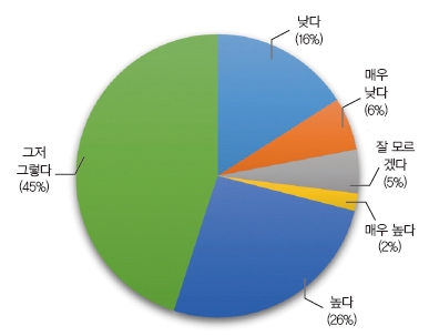 반면, 국내 공장자동화율 수준이 ‘그저 그렇다’는 응답도 45%, ‘낮다’고 보는 응답은 16%, ‘매우 낮다’는 6%나 되었다.