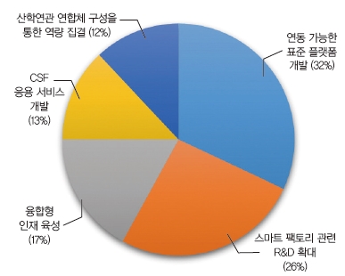 CSF 조기 확산을 위해서는 ·연동 가능한 표준 플랫폼 개발이 시급하다’는 응답자가 32%로 가장 많았고 ‘스마트팩토리 관련 R&D를 확대해야 한다’는 응답도 26%나 되었다.
