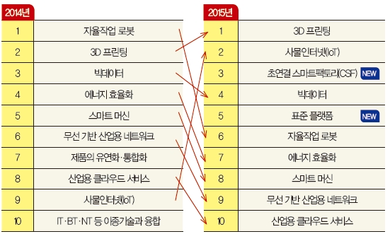 이를 반영하듯 ‘2015년 산업자동화 10대 핫 키워드’를 묻는 설문조사에서 관련 업계 및 전문가들은 ▲ 3D 프린팅 ▲ 사물인터넷(IoT) ▲ 초연결 스마트팩토리(CSF) ▲ 빅데이터 ▲ 표준 플랫폼 ▲ 자율작업 로봇 ▲ 에너지 효율화 ▲ 스마트 머신 ▲ 무선 기반 산업용 네트워크 ▲ 산업용 클라우드 서비스 등을 올해 핫 키워드로 꼽았다.