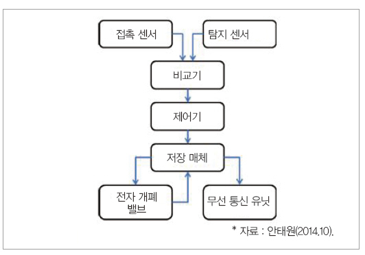 •비교기와 제어기는 탐지 센서와 접촉 센서로부터 전송된 신호처리 기능을 실행하는데 신호처리 결과에 따라 출입구의 개폐를 제어한다. 센서 및 전자 개폐기의 작동상태에 대한 정보를 저장했다가 일정 주기로 관제센터에 전송하는 근거리 무선통신 장치(WLAN : Wireless Local Area Networks)로 구성돼 있다.