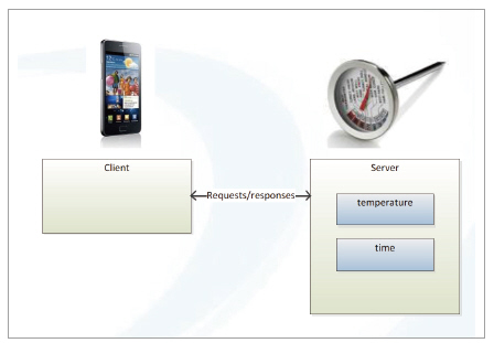 온도계에서 필요한 정보는 온도와 시간이다. 스마트폰에서는 온도에 대한 정보를 블루투스를 통해 온도계에 요청하고 측정된 온도와 시간 정보를 전달받게 된다. 이것은 마치 클라이언트와 서버 구조에서 요청을 하고 정보를 받는 구조와 유사한 구조로 동작하게 된다.