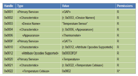 이전의 블루투스 스펙(사양)에서는 L2CAP, RFCOMM, SCO같은 프로파일 바탕 위에 통신을 하기 위한 프로파일들이 특정하게 정의된 구조였다. 하지만 블루투스 4.0에서는 다양한 장치를 지원하기 위해 새로운 프로파일을 정의하고 사용할 수 있게 하는 유연한 구조를 가지고 있다. 그림 6은 온도계의 정보를 다루는 프로파일의 예이다.